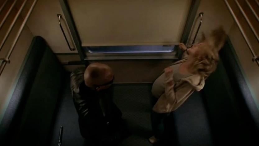 This episode kicks off with Blade (Kirk “Sticky Fingaz” Jones) and the prisoner he rescued last episode, the pregnant Vanessa (Sonja Bennett), on a train outside of Paris. When Vanessa starts to scream for help, which is completely reasonable given that she’s handcuffed with a strange, stoic man who just injected himself with some drug, Blade takes the step of bitch-slapping her unconscious.