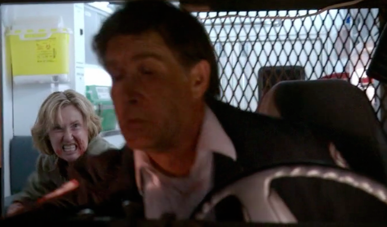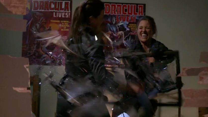I thought all this as the camera held steady on Krista’s mother, but the scene was still. And as I saw Krista’s mom laying there, bleeding from her wrist, I found myself wondering “Where’s the pillow Krista used to choke her? Is the choking coming?” Then the episode shows its hand and it fooled me — the silence is broken by Agent Collins’ body being thrown over the body of Krista’s mom, and the episode begins where I wanted it to–with the vamp-on-vamp fight between Glynnis and Krista.