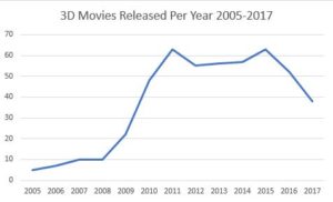 This growth continued until 2011, when 63 3D movies were released.  Growth then leveled off through 2015, when the number of films started to decline.