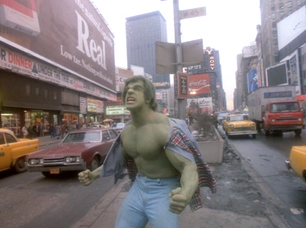 You also can tell it’s cold. There is snow on the ground, and the Hulk’s breath is visible as he roars. The wet cement and brown color of the film stock makes New York feel seedy and dangerous, as I remember thinking of it before I went. The camera circles round and round the Hulk, giving me another great look at the Times Square of the 70s. Shockingly they had those shady electronics stores on every corner even back then.