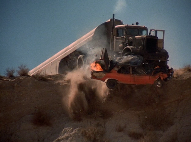 We do get some new footage interspersed with Spielberg’s, seeing the car hit some barricades Dukes of Hazzard style but the majority of the external shots are from Duel. As is the plot as the radiator hose of the Plymouth gives out and the car overheats. The car barely makes it to the apogee of the mountain, and then pick up speed as they coast down the other side. This happens near the climax of Duel and leads to an exciting and innovative ending. But in Never Give a Trucker an Even Break it instead ends with David losing control of the car and hitting the side of the mountain. Joanie is knocked out, and Ted and Mike bear the truck down on the car. The stress causes