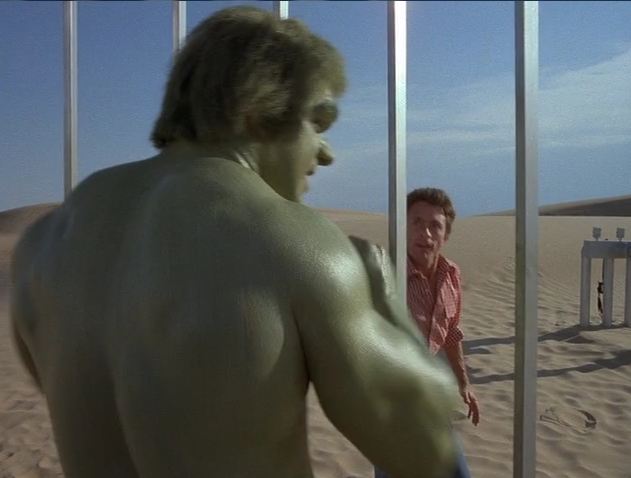 It starts like a scene from Oliver Stone’s The Doors, David walking across sand dunes in his bell-bottom jeans. In this desert is the only time the entire series that David and Hulk are on the screen at the same time, and it’s a remarkably powerful sight to behold. Ferrigno plays it so well, all confidence and strength, and puny Banner runs from Hulk!