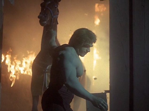 Hulk-Out #1  Rainbow’s End is no match for the Hulk.  Hulk grabs the reins, knocks aside some bails of hay, and punches through a wall to lead out the panicked steed.  It’s a funny scene and, like Bixby before him, you can see Ferrigno break character a bit, dealing very gently with the horse. Seeing the workers coming, Hulk runs off with Rainbow’s End, and I wonder why he doesn’t just let the horse go.   Sitting still with the horse Hulk begins to transform back into David while the worrkers extinguish the blaze.  But one worker, Logan, was out looking for Rainbow and witnesses David’s metamorphosis.  Now Logan is one of the small number of people who know David’s secret.